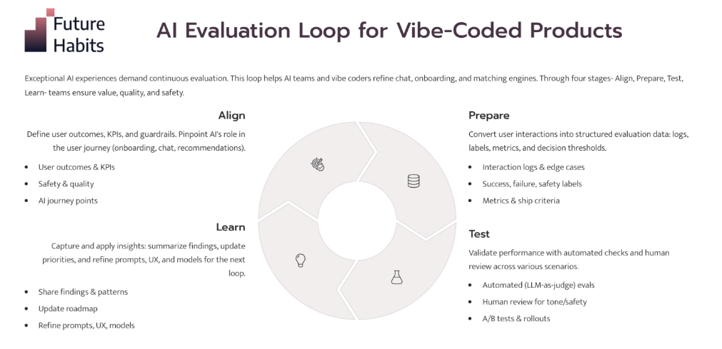 At FutureHabits.tech we help teams turn model features into results they can measure. We start with your real user traces, define clear pass and fail rules, and connect evals to your build pipeline. Quality improves with every release, not just every quarter.